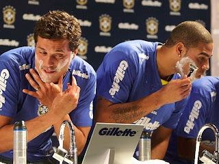 Inaugurando seu patrocínio à seleção brasileira, a Gillette colocou as estrelas do futebol do país para fazerem a barba antes da coletiva de imprensa dos jogadores (foto abaixo), aproveitando a própria estrutura montada. Situação oportuna e inusitada para se divulgar a parceria, gerando mídia espontânea e buzz.