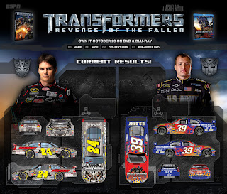 Para promover o lançamento do DVD / Blu-Ray do filme Transformers 2 – A Vingança dos Derrotados, a Paramount inovou.A empresa decorou os carros de Ryan Newman e Jeff Gordon, com as identidades da Optimus Prime e Megatron, respectivamente, na corrida de 17 de outubro (imagem abaixo). Difícil enxergar maior adequação…